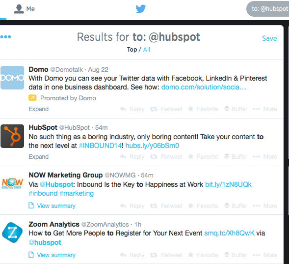 Do you want to see who is talking to (or about) businesses like yours? Type “to: @username” into the search box.