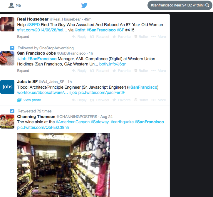 Only want to see conversations happening near you? No problem. Here is a search for all tweets within four miles of San Francisco’s 94102 zip code, tagged with #sanfrancisco:
