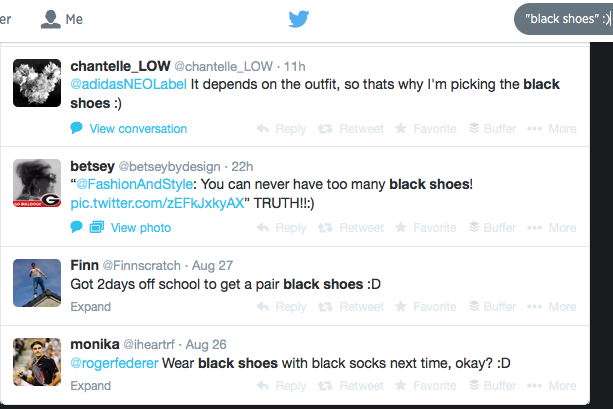 You can also search for tweets based on subject and sentiment. Here is a query for people saying positive things about black shoes: